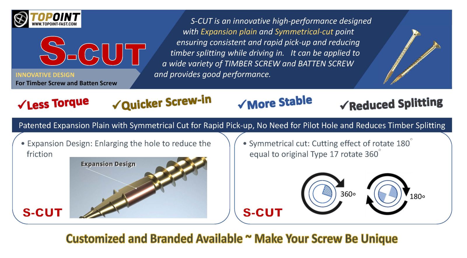 S-CUT is an innovative high-performance designed with Expansion plain and Symmetrical-cut point ensuring consistent and rapid pick-up and reducing timber splitting while driving in. It can be applied to a wide variety of TIMBER SCREW and BATTEN SCREW and provides good performance.